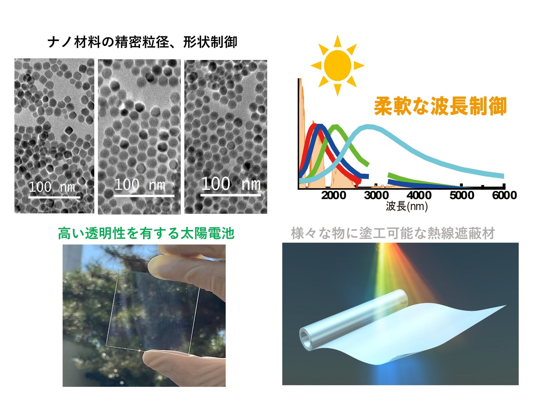 この熱線を選択的に吸収、電力に変換し、透明発電ガラスを開発します。